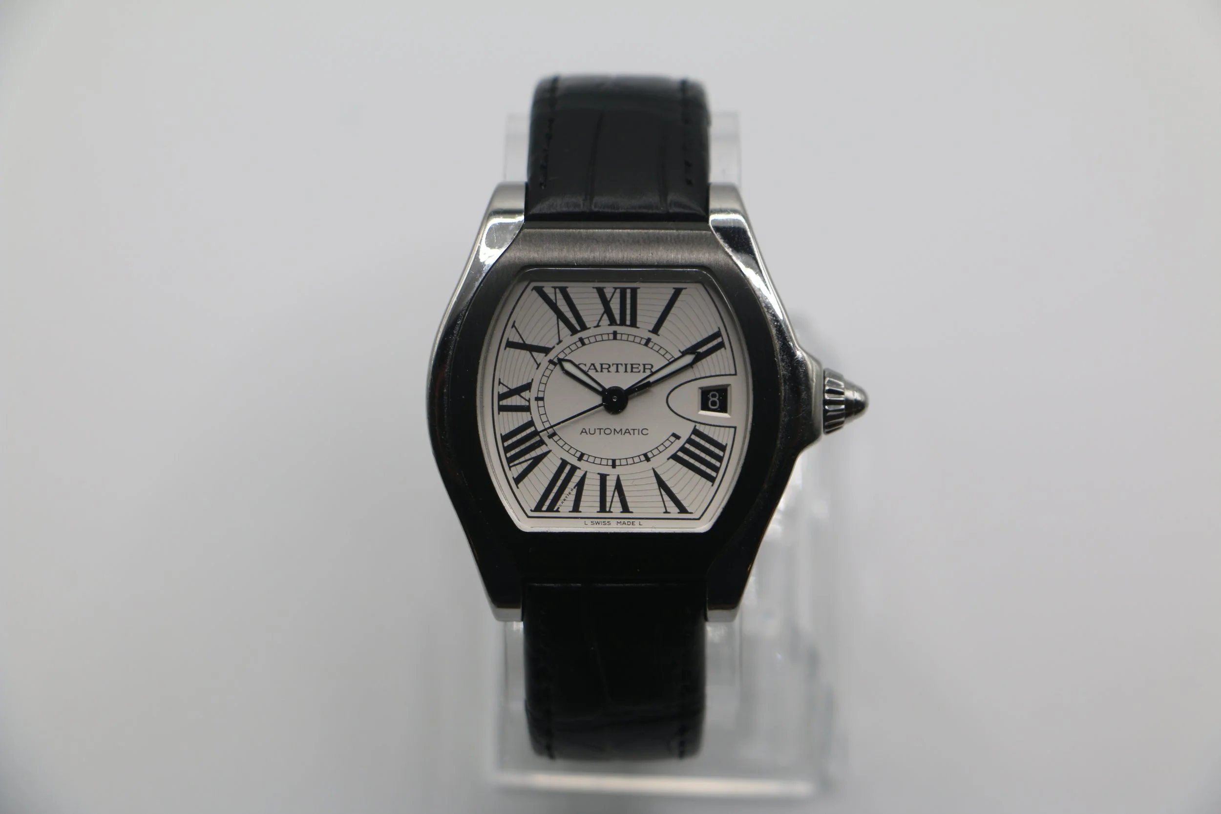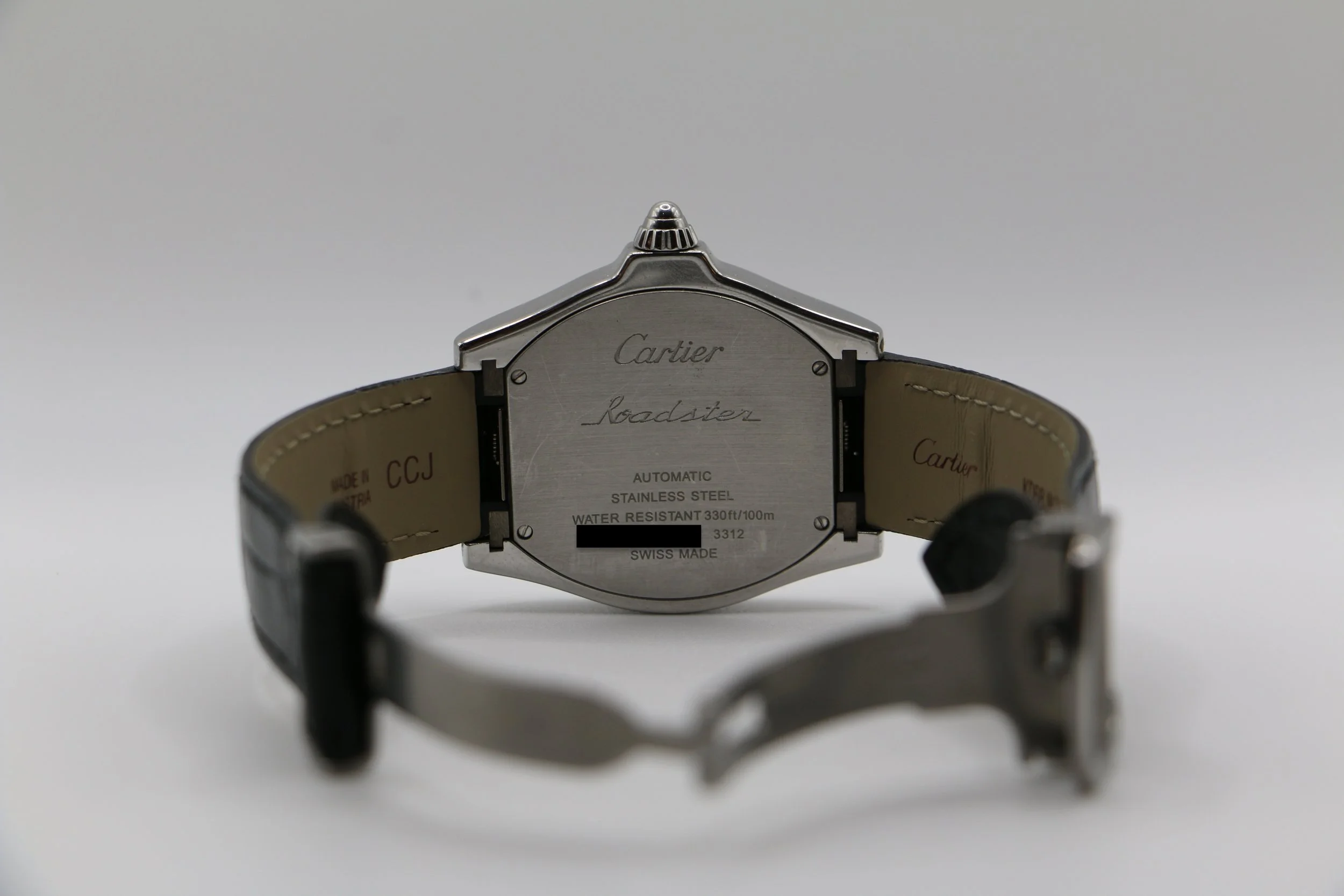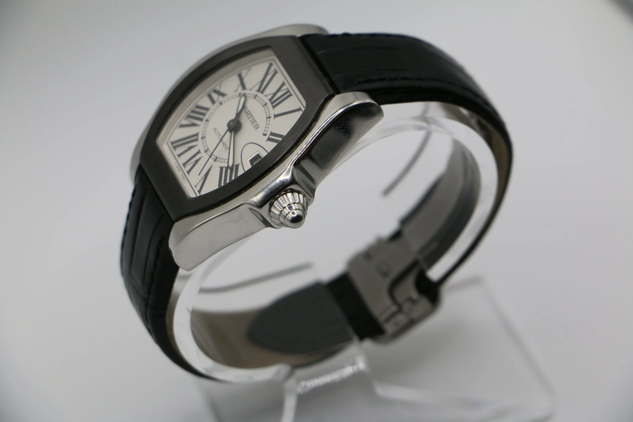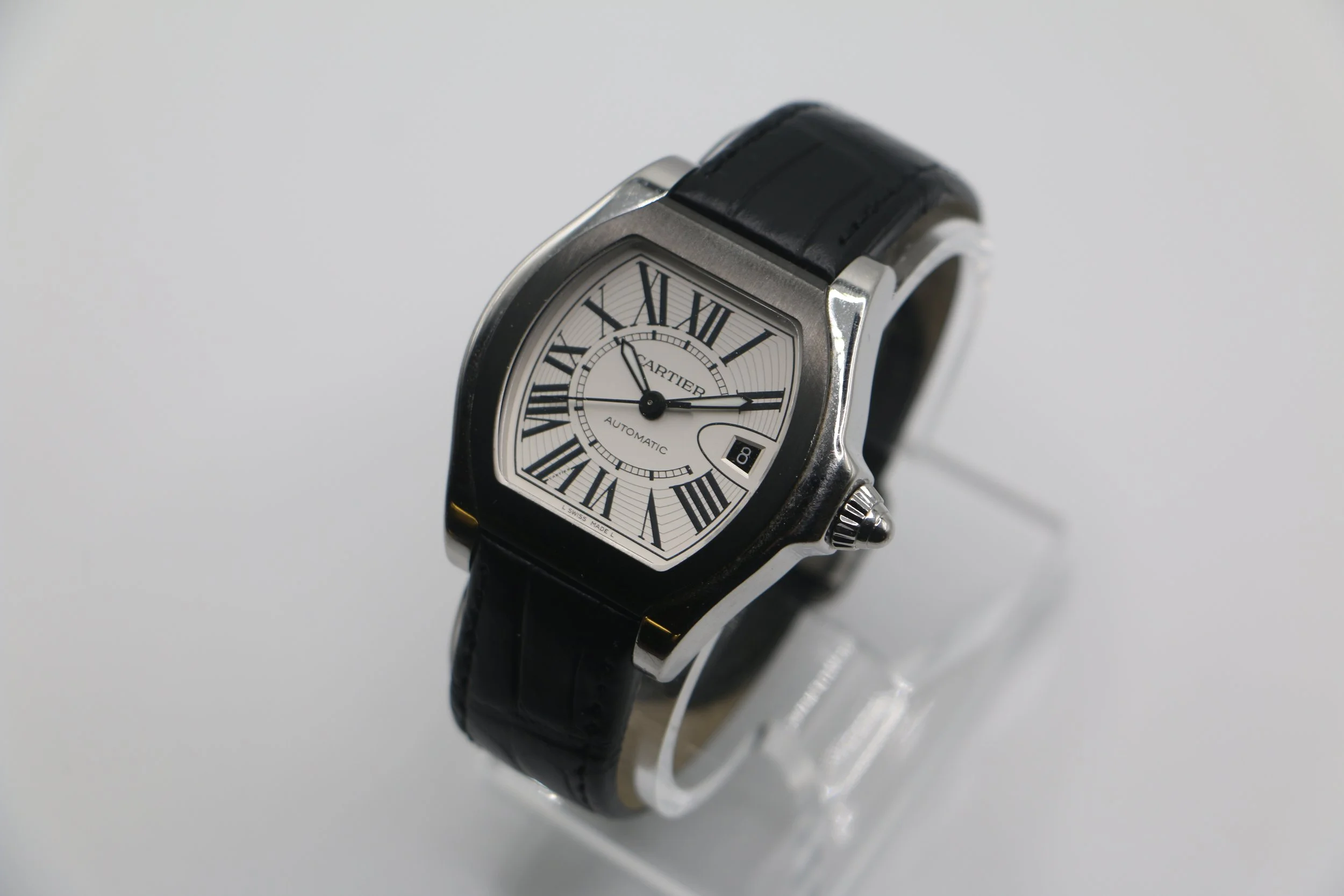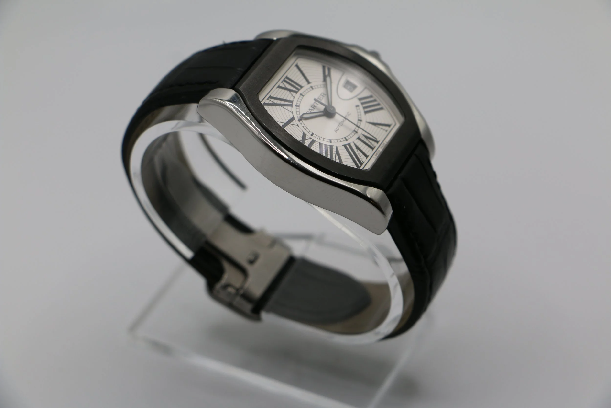 The Cartier Roadster S separates itself from the traditonal Roadster lineup and is sure to hold a front row seat in your watch roll. This model features a DCL bezel, black alligator strap paired with a deployment clasp. Its tonneau case shape which also pays homage to mid century automotive, makes it the perfect watch for someone looking for a daily driver that brings classic Cartier elegance with a flair. Powered by an automatic movement, this Roadster S is in great condition with minor signs of wear and brand new Cartier strap. This watch comes with papers and a Cartier travel pouch.